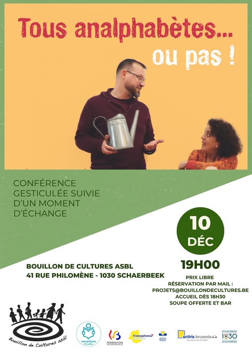 - Mercredi 10 décembre à 19h00, Tous analphabètes… ou pas! à Bouillon de Cultures (rue Philomène, 41 à Schaerbeek). Info et réservation : projets@bouillondecultures.be